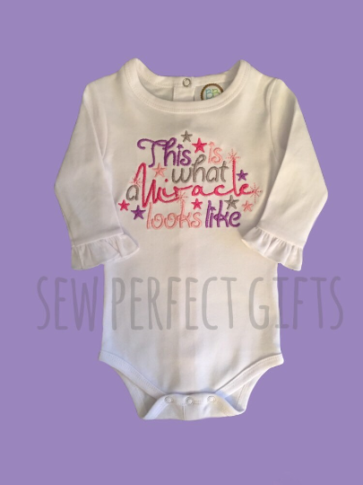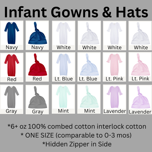 Our baby collection includes long sleeve plain and ruffled gowns as well as short and long sleeved baby onesies. We currently carry white, blue and pink gowns and white onesies with additional colors in stock for different holidays. Unique button up backs on our onesies make is super easy to change your baby's clothes!